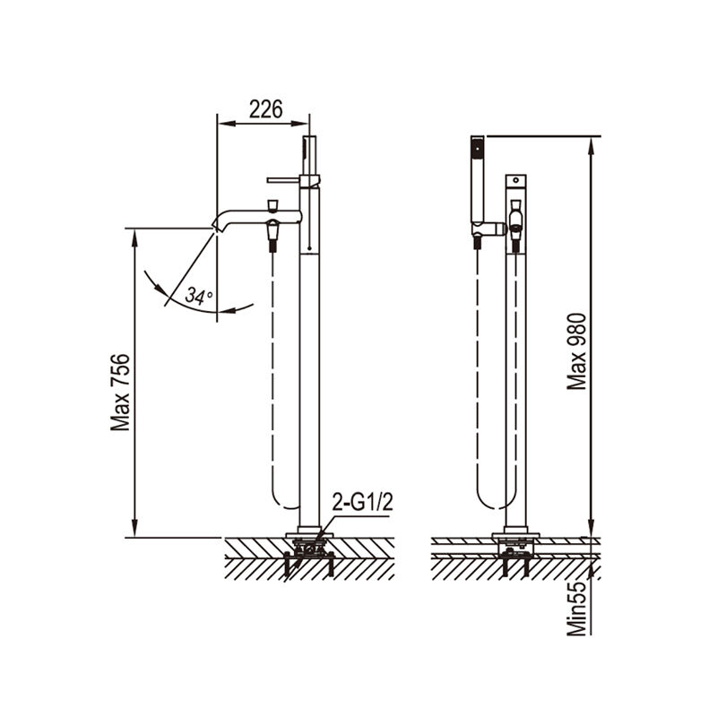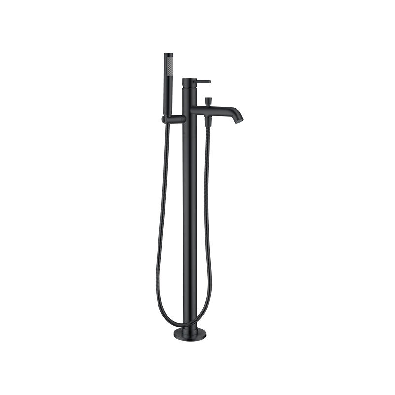 جسم صنبور حوض الاستحمام القائم، أنبوب الصنبور من النحاس الأصفر، دُش يدوي، خرطومان للسخن والبارد، غطاء القاعدة، أدوات التثبيت وإرشادات التركيب.