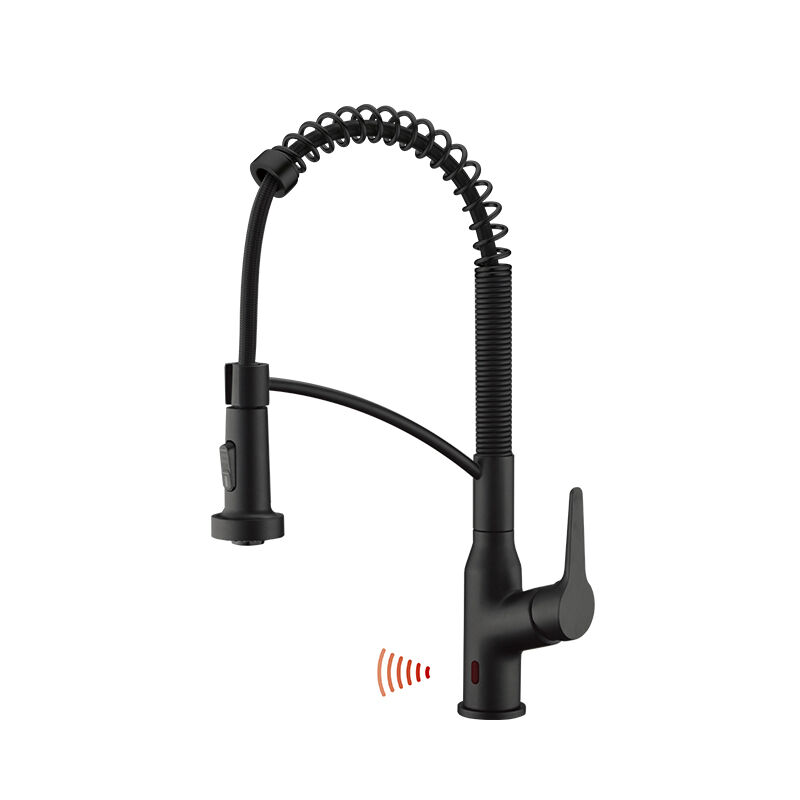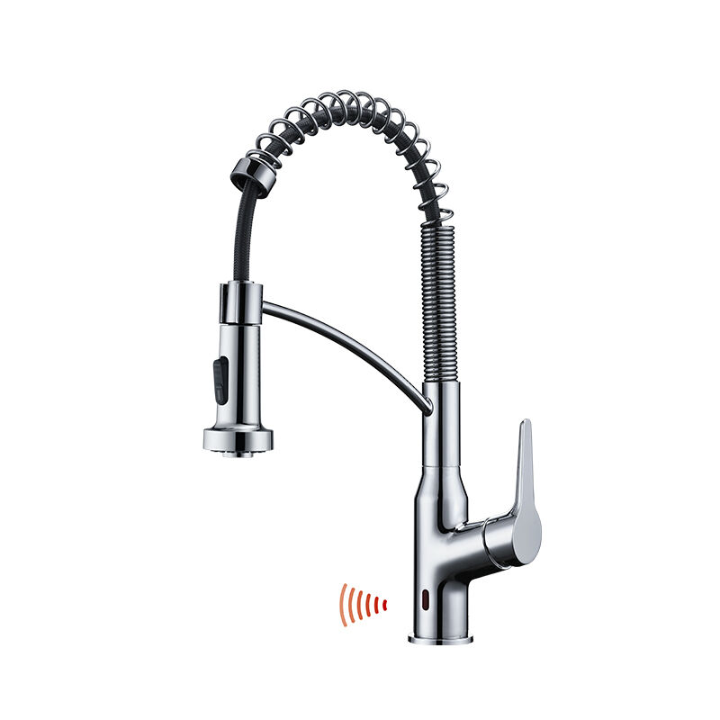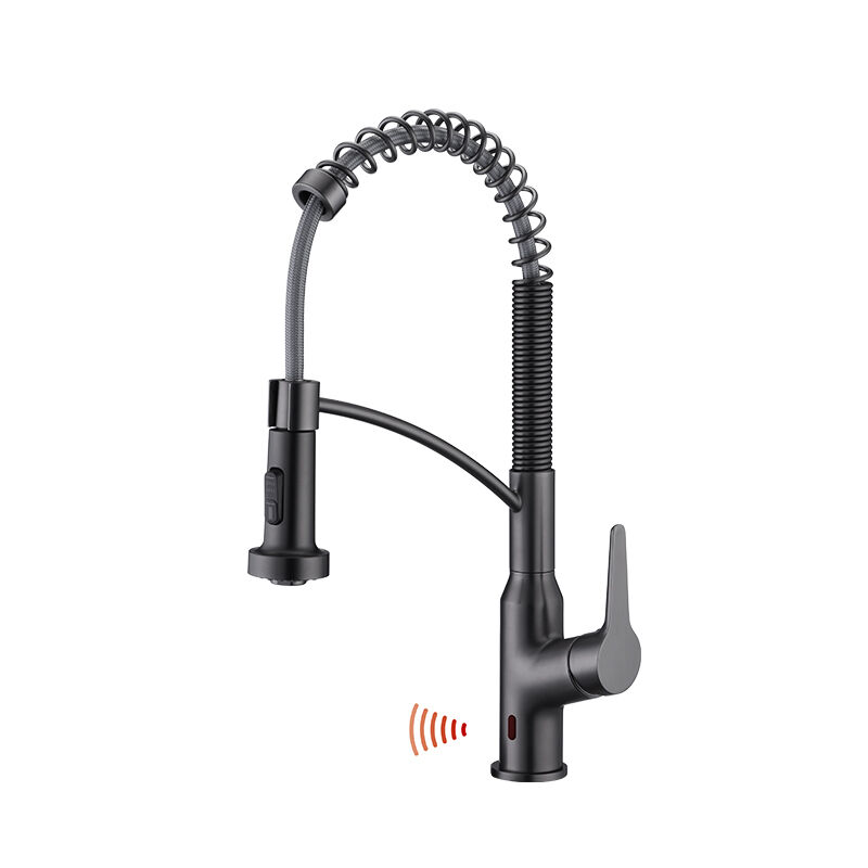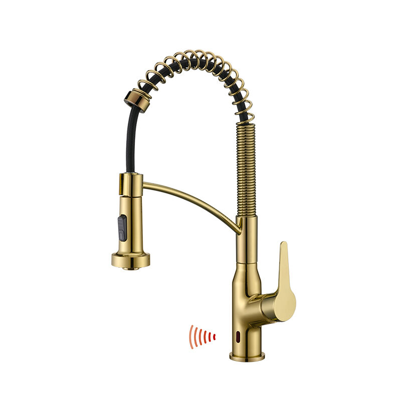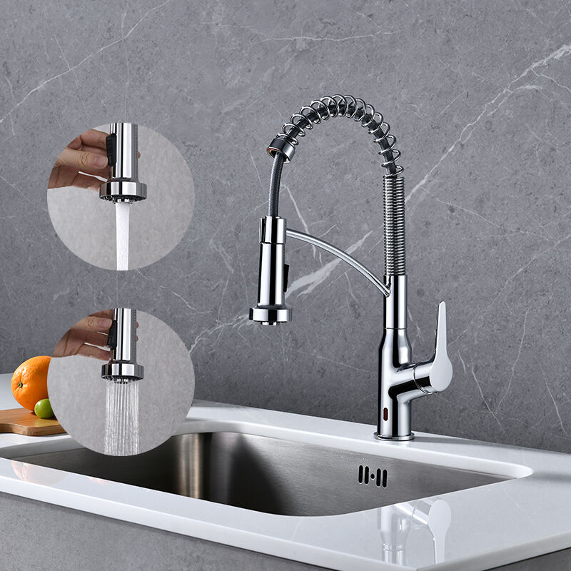Trendy pull-out kitchen faucet with fingerprint-resistant finish option, 2-spray settings, complements modern kitchen decor, durable brass core, easy to maintain