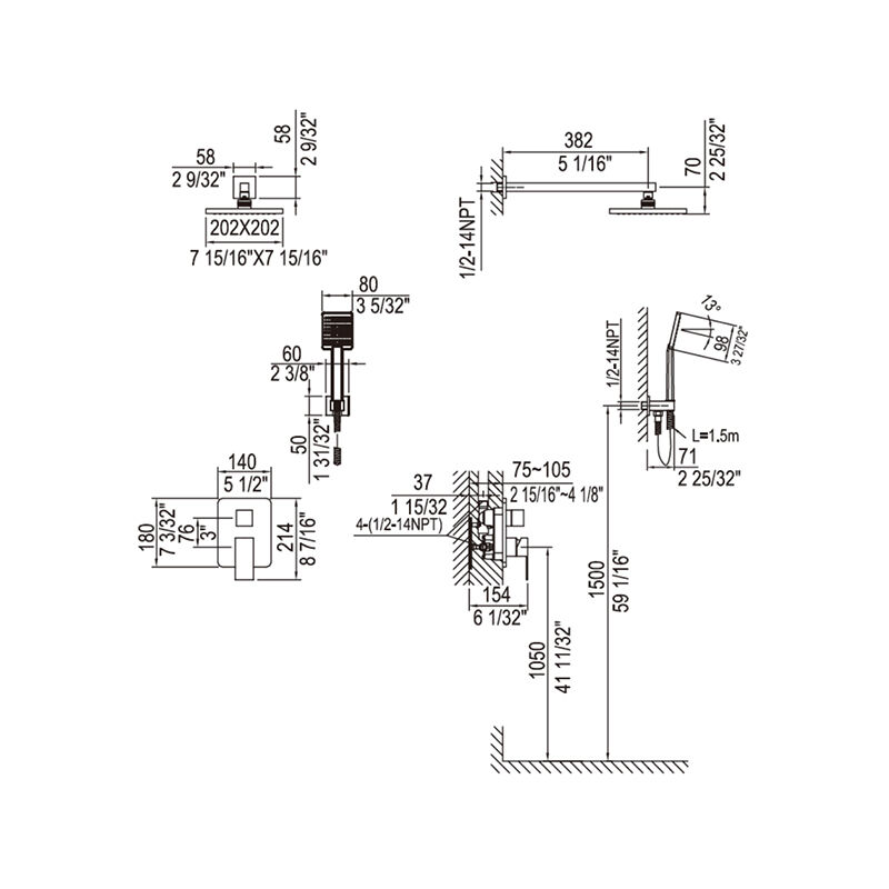 Aplikasi: Bilik mandi utama dengan pancuran atas dan pancuran tangan, bilik mandi yang boleh diakses, serta bilik mandi hotel.