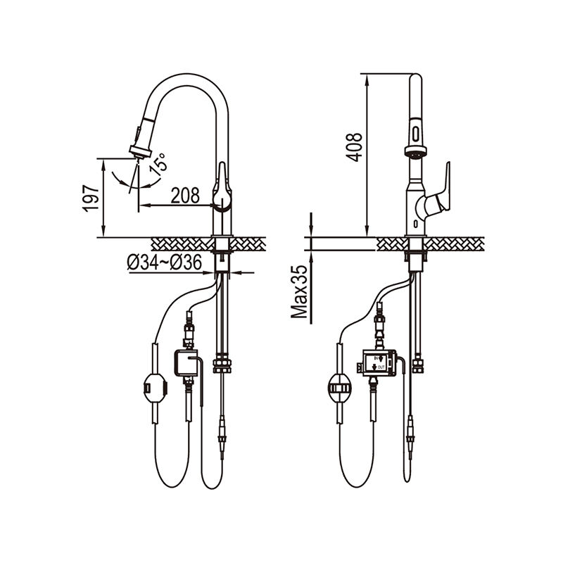 This innovative pull-out kitchen tap combines hygienic non-contact technology with maximum flexibility. Enjoy the convenience of automatic water start/stop - perfect for greasy hands or full hands! The extra-long pull-out head with 360° swivel reaches every angle of your sink, while the 2-in-1 spray function (focused jet/economical spray) and precise one-handed temperature control make any washing task a breeze.